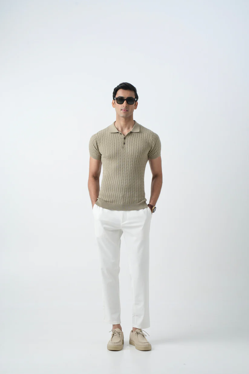 Beige Knit Polo Shirt is a blend of style, comfort, and sustainability. Made from the finest organic cotton, it features a classic cable knit pattern, button placket, and a regular fit