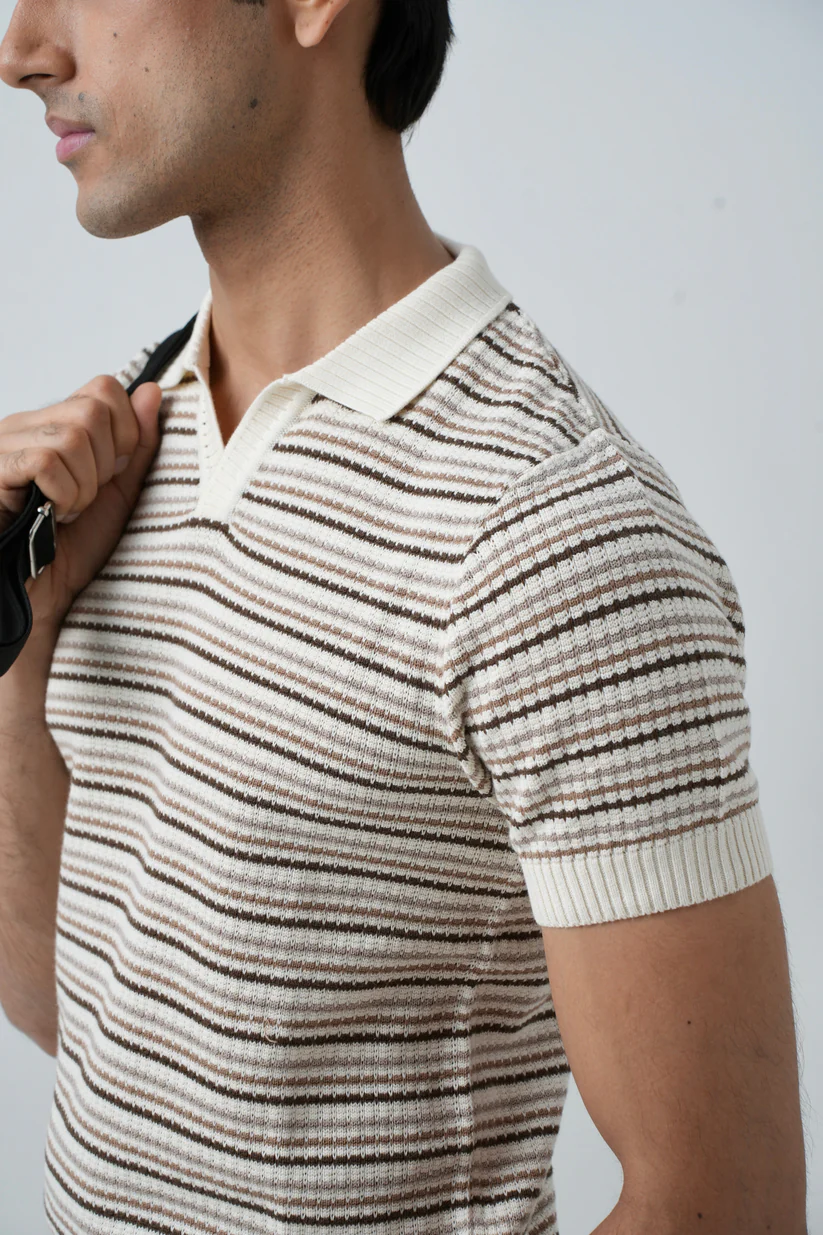 The Light Stone Knit Polo Shirt is a mid – weight knitted style shirt, arranged in a colourblock panel design.